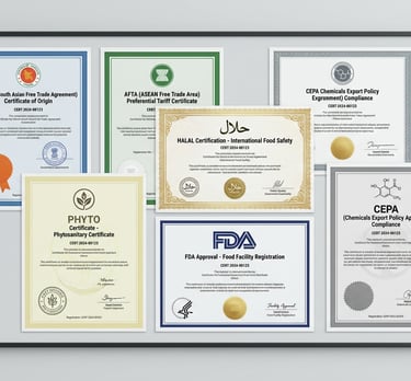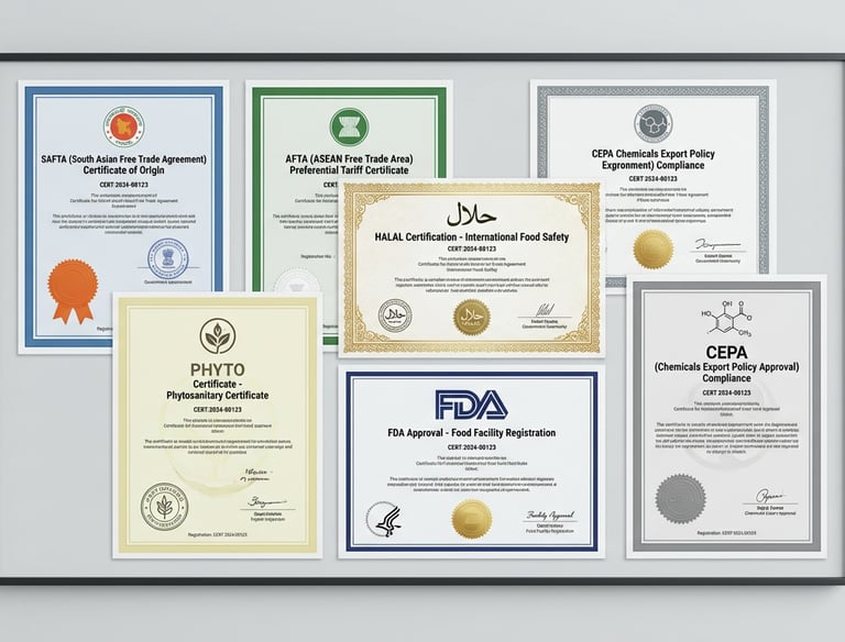 e.g. ISO, GST, IEC, FSSAI, SPICE BOARD, APEDA, ICE GATE, AD CODE, RCMC Renewal